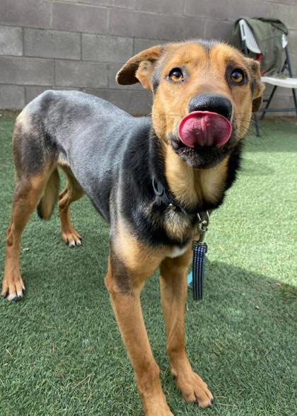 Mongoose is laid back and low energy, with a calm presence that makes him easy to be around. He has been great on leash and does well in his kennel. He is very treat motivated, which has helped him build confidence and continue learning that people can bring good things into his life. Once he feels comfortable, he will approach for affection and his soft, grateful nature really shines through.