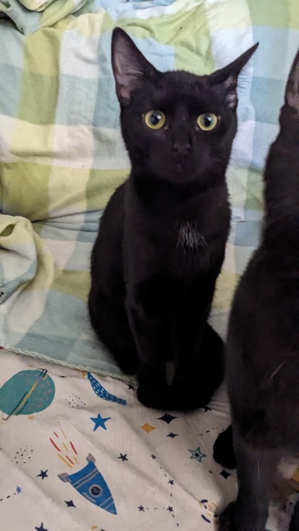 Jayna: Named after "Jaina" from the old Star Wars books, Jayna is the second largest of her five sibligs, and with them was rescued from a park after being abandoned there as young kittens. She, like her almost-identical brother Jayken, is extremely energetic and playful, but can be told apart from him by her very prominant eyes, and a faint white patch on her chest. Her purr isn't very loud, but she makes up for it by loving to cuddle when she's ready for a nap. She's spent her life since being rescued playing with her siblings, and enjoys trying to play with older cats too, and before she was rescued, she played with children who came to the playground she was left at! She is very outgoing and intelligent, and would love to come home with you!