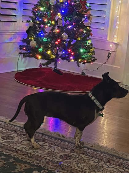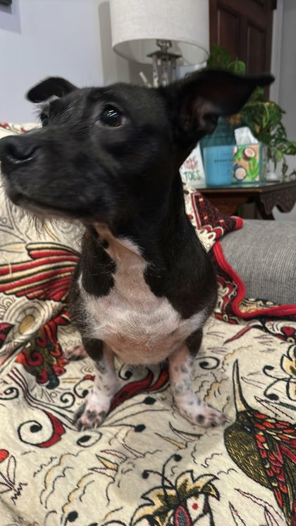 Ellie Grace is great with kids, dogs and cats. House and crate trained. She walks well on a leash. She is on a fish based kibble for allergies. She is 36lbs and seems to be a terrier, dachshund mix