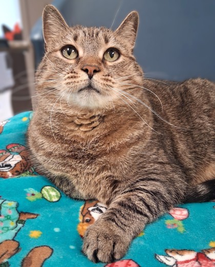 All of that patience paid off. I've grown so much that I've been promoted to hallway duty. I'm the first face you see when you step into the cat wing of the SPCA. I greet you with a chirp, a confident strut, and a graceful weave around your legs, like I've been expecting you all along. I soak up attention like a star, then flick my tail to remind you that royalty enjoys affection... on its own terms.