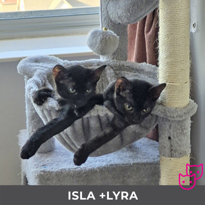 Lyra is a smart, determined, and loving girl! Lyra loves kicker toys, springs, and chasing anything that jingles. She has lots of fun playing with her siblings, especially her sister Isla. Lyra loves to come up on the bed for a cuddle first thing in the morning, but she may need some help getting up/down. Lyra was born with Cerebellar Hypoplasia (CH), commonly known as wobbly kitten syndrome, which is a congenital neurological condition that can cause tremors, wobbling, and uncoordinated movements. CH is not contagious, is not progressive, and does not cause any pain to affected cats. Cats and kittens with CH have normal life expectancies, although they will need attentive families who can make accommodations for their special needs. Lyra is able to run, play, and climb, however she may need smaller steps to get up on beds and couches, and soft areas for landing in case of falls from high places. Lyra gets along well with other cats and kittens. She has been a bit shy at first on playdates with young children who are used to being around animals, but she warms up and makes friends when she is allowed to go at her own pace. We're not sure how Lyra feels about dogs. Lyra is bonded with her sister Isla and they MUST be adopted together.