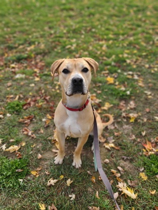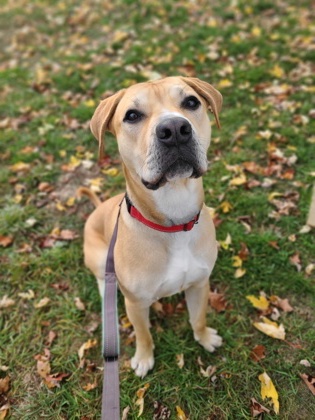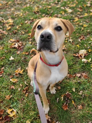 A dog with spunk, energy, and smarts! Amos is a dog who loves food and treats, making him easy to train! He's been working with a few different staff and volunteer members and has made a bunch of progress on his leash manners! Although he can still be jumpy, and at 51lbs, doesn't realize not everyone appreciates his "Hugs"! Once you've become friends with Amos, he's a giant baby who wants endless attention. He DOES take a moment to warm up to strangers (He's a corso mix, a guardian breed!) and will need someone to continue his socialization!