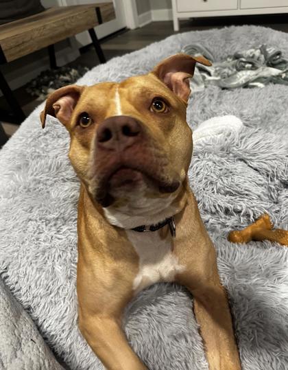 Meet Vinny - a handsome young brown pittie mix with amber eyes and the cutest Yoda-style ears you've ever seen. Once a stray, Vinny hasn't let his rough start dim his love for people. He's never met a stranger and absolutely adores kids - he would truly thrive in a home with children who want a loyal, fun-loving companion by their side.