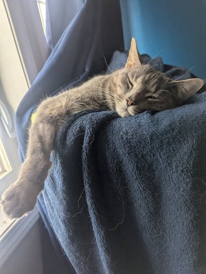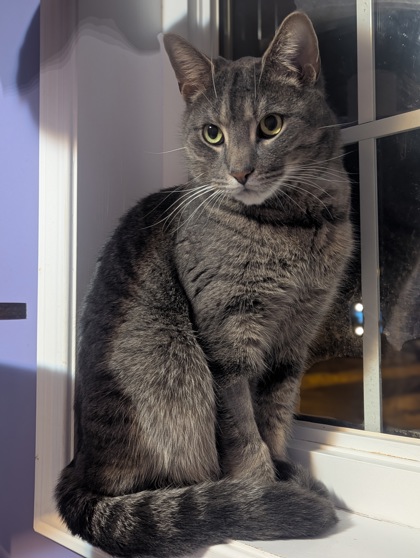 Wilbur has been shy in the home, but he's steadily coming out of his shell. He enjoys being near people and will often observe from a cozy cat tree or enclosed space, like a cube or box. He prefers to approach humans on his own terms and doesn't enjoy being picked up, though he'll tolerate it briefly. He's very food-motivated (Churus are a huge hit!) and this has helped build trust and confidence. Wilbur has a playful side that's still emerging, he plays independently right now and is a bit bashful about joining in, but his foster is confident that with patience, his playful personality will continue to blossom. He also loves to snuggle close and keep a calm presence nearby so he can "keep an eye" on things.