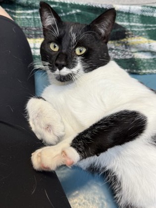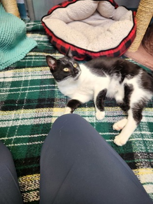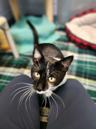 With his dashing tuxedo coat and bright, curious eyes, Chip is always dressed for the occasion, especially if that occasion involves cuddles! This sweet boy is as friendly as they come and never misses a chance to make new friends. Chip isn't just handsome, he's also a total heart-stealer. He loves to curl up in a quiet lap, showering you with gentle little kisses and soft kneads. He has a bit of a whisper (sometimes he tries to meow, but no sound comes out) making him the perfect low volume companion.