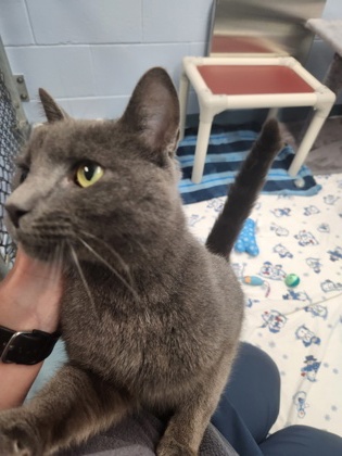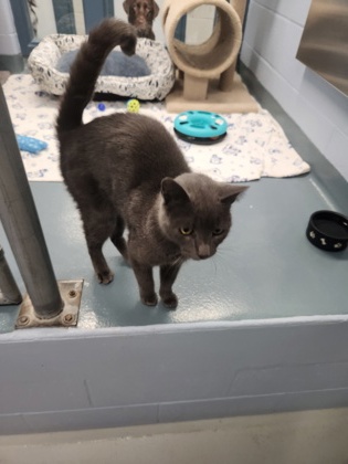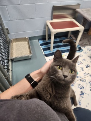 Meet Homer, a sleek grey cat with a raspy little meow and a heart full of love! This friendly gentleman adores people and isn't shy about showing it, he may just try to climb onto your shoulders to be close to you or purr his way into your lap (and your heart).