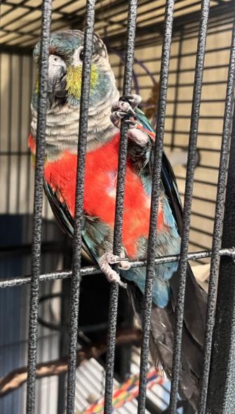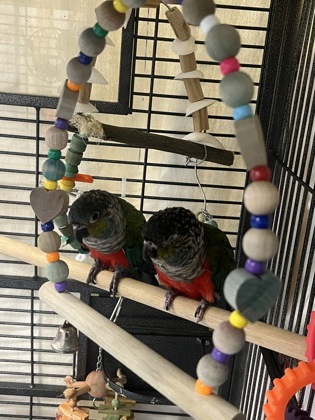 Hay is a beautiful conure with a gentle spirit and a big heart. They may be a little shy at first, but once they feel safe, Hay shines with curiosity and affection. Hay is deeply bonded to their best friend - a sweet boy conure with a shrunken eye - and rarely leaves his side.