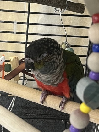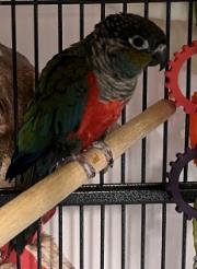 This sweet boy conure may have a shrunken eye, but it makes him special! His best friend is Hay - they're a bonded pair and do everything together: eat, play, preen, and snuggle. Their bond is beautiful, and Hay is always nearby to offer comfort and confidence.