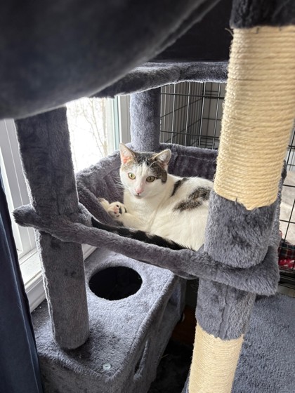 Meow, I'm TanQR. I'm super friendly and communicate a lot with my mouth. My current hobbies include playing with springs, hanging out in the cat tree hammock and eating. I know how to use my scratching post and litter box. Oh and not to forget, did I mention I'm a super cat with only 3 legs?!