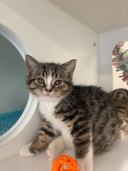 Take a look at Ralphie! He is a sweetheart who loves cozy naps, soft blankets, and jumping after toys. He would enjoy your soft pets and cuddles with his gentle, shy personality. He is quite the ball of fun once he warms up!