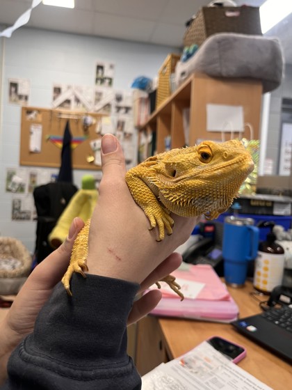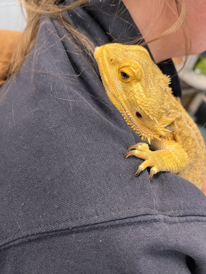 Ringo is a sweet, gentle bearded dragon with a heart as warm as her favorite basking spot. She loves nothing more than relaxing on your lap, soaking up attention and calmly watching the world go by. When she's feeling adventurous, Ringo is happy to tag along on walks, proudly perched on your shoulder like a tiny, scaly sidekick.