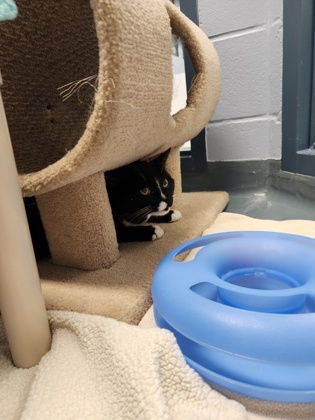 S'mores is a dashing little tuxedo boy! He's a bit shy at first, preferring to watch the world from his cat-tree cubby before deciding it's safe to say hello. But give him a little patience, and he'll reward you with head nudges and affection. This sweet boy would thrive in a calm, peaceful home, somewhere he can take his time, explore at his own pace, and be showered with love from older children (or adults!) who understand that good things come to those who wait!