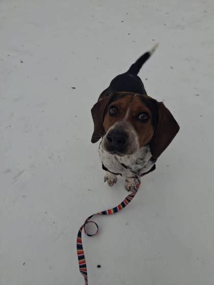 First time dog owner possible. His new family ideally should have previous hound breed experience or have done hound breed research prior to adoption.