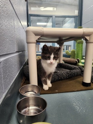 This petite little grey-and-white cutie has officially decided that the good life is long overdue... and he's now looking for a new family to call his own! Ozzie didn't have the easiest start, but you'd never guess it watching him bounce after toys or confidently claim the coziest place in his kennel. He's sweet, playful, and the kind of kitten who will zoom around one minute and then curl up beside you like a tiny, purring marshmallow the next. He loves attention, loves playtime, and loves being involved in whatever you're doing.