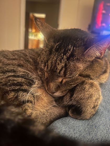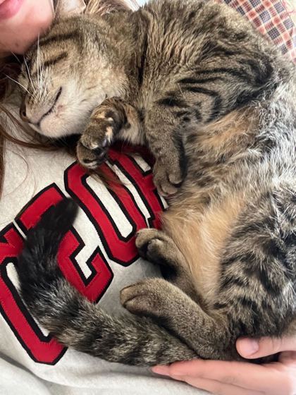 Abigail is a sweet, snuggly tabby who always appreciates a warm lap. She spends her days looking out the window, zooming around the house, and napping on blankets. She is friendly even to strangers and is cuddly without being clingy. Her ideal home would have a loving owning who can give her both attention and space, with a few hiding spots for comfort.