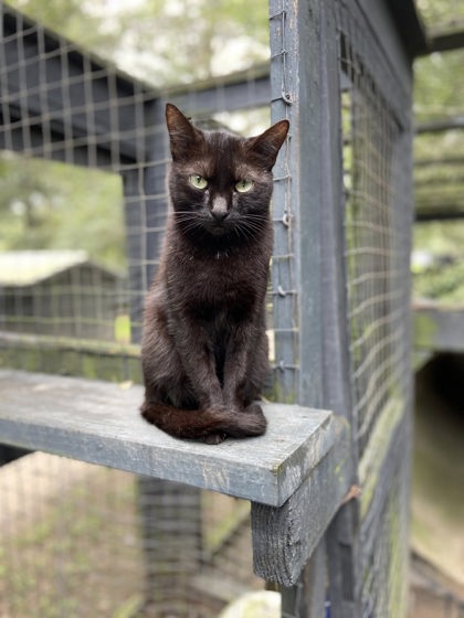 Cashew is a beautiful and elegant black domestic short-haired cat who could become a delightful companion. Initially shy, she responds well to treats.