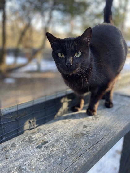 Hickory has resided at the sanctuary since her days as a timid kitten. Over time, she forms a bond with her caregiver. She is a gal, both beautiful and graceful. Hickory has grown up at Hallie Hill alongside her brother Cashew. She's sleek and mellow with bright green eyes. She can be a little shy at first, but once she warms up to you, she'll headbutt you for unlimited pets.