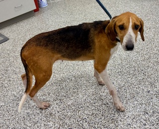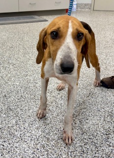 Rainey is a young foxhound who was somewhat skittish at first, but warmed up quickly. She is very food motivated.