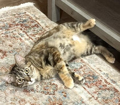 As I have gotten to know Kit, she is a loving, silky soft kitty who has a soft purr and often will sit on my lap for pets and belly rubs. The way to get to know her is with treats and lickables, as she loves them. Her litter box habits are excellent.