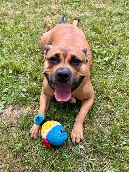 Big mama Daisy May is a happy hoot and a half! This sweet and spunky lady is a big ham for affection. She's a great balance of attentive and playful: she is smart and has some solid manners down already, but will also keep you laughing with her goofy personality and antics.