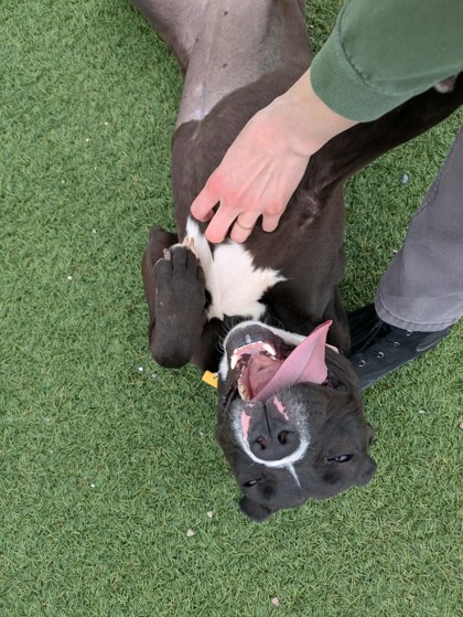 Pippy is a charming mix of snuggly and playful. She is known for being quite affectionate while out and about with volunteers. She practically melts for pets, leaning right into you to soak up belly rubs, a goofy satisfied grin on her face. She has some energy but once she has a chance to burn off some yayas, she's very lovey.