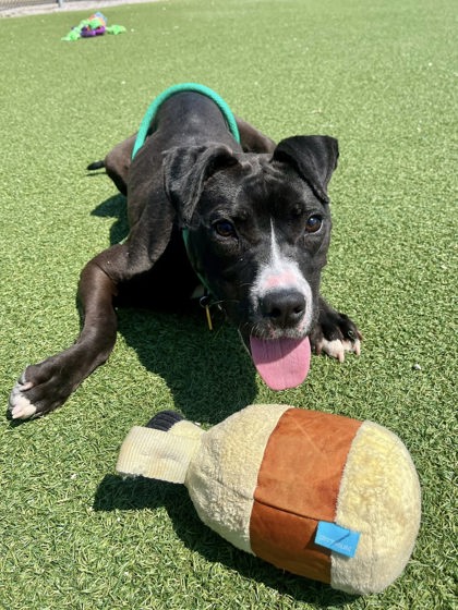 Pippy also loves to romp and play! At around a year old, she is active and curious with some youthful energy. She can be bouncy and puppyish at times, but she's also responsive to guidance and learning more each day. In a home of her own where she can get into a routine, we think she'll thrive. She already knows how to sit and is eager to work and learn more, especially with treats involved. With other dogs, she has been puppyish and playful, and she could enjoy having a canine companion in her forever home.
