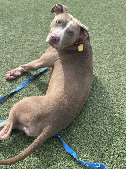 This pretty lady is sweet and loving, but can also be playful. Her favorite hobbies seem to be napping in the sun, ideally on a soft spot, and soaking up snuggles. But if you want to play fetch, she's absolutely in! She perks right up to play ball and loves running around the yard. But after a bit of exercise, she's ready to chill out again.