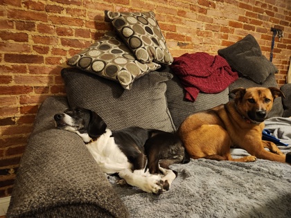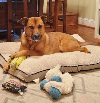At home, Cooksi is an absolute dream. She's fully housebroken, crate-trained, and happily sleeps through the night or a full workday without issue. Her crate is a cozy, positive space where she eats and rests, though she may occasionally remind you-with a soft little cry-that she'd rather be out hanging with you. She loves lounging on the couch or her dog bed, chewing on bones, and collecting toys... and sometimes random items like gloves or laundry, just to keep things interesting. She's not a velcro dog, but she does like being nearby, quietly keeping you company while she naps (which she does expertly).