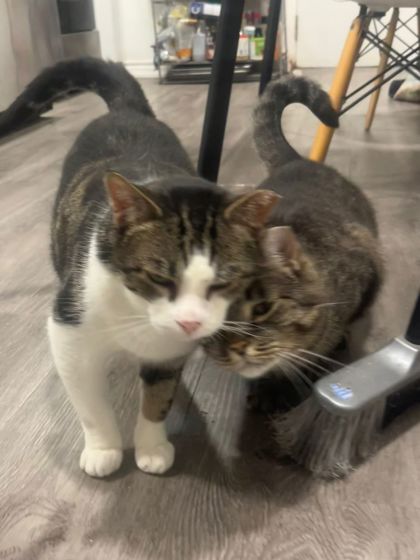 Sammy and Dan Dan are bonded best friends who will melt your heart with how affectionate they are with each other, particularly in the mornings- they will mash their faces together, purring their heads off while they rub their chins on anything they can find as they wait for breakfast. Very occasionally they will have a minor scrap if they're bored.
