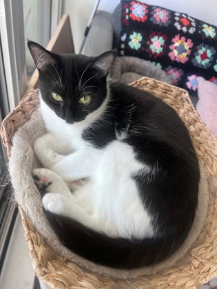 The perfect combination of playful and sweet, Batcat is sure to win the hearts of anyone who meets her. She is a quiet, chill cat who loves to lounge in her tower during the day. Her unique markings resemble a certain famous DC Superhero, and while she hasn't been caught fighting any crime yet, we're certain that with the right love and attention she will grow to become a stoic protector of your home (and heart). When she's not entertaining herself with mouse toys or playing with her other feline friend, she'll flop onto her back next to you, inviting you to pet her at her request. She's shown a strong affection for the resident cat of her foster home, and will likely thrive in a home with other cats (with proper introduction, of course!)