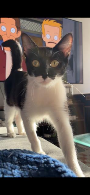 She's slow to warm up to new people, but not shy once you've earned her trust. She'll tell you exactly what she wants at all times. Her bursts of energy are infrequent but not to be reckoned with (the girl could teach a masterclass on zoomies). She has shown no aggression whatsoever to humans or other cats, even when afraid. She's great at travelling in her carrier and has had no issues at the vet. Batcat is not only adorable, but endlessly entertaining in her demeanor and interactions with the world around her. It would be nearly impossible to feel boredom or loneliness with a cat like Batcat.