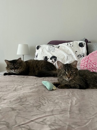 Her peak playtime for zoomies is in the middle of the night and early morning. You'll hear her trilling up a storm as she plays with her foster sister, Anastasia! The two have formed a lovely bond and enjoy playing together; cuddles may still be on the horizon, but their friendship continues to grow. Hazel has plenty of kitten energy to keep you entertained. She purrs loudly when she's happy and also self-soothes by purring when she's stressed (something to keep in mind during vet visits).