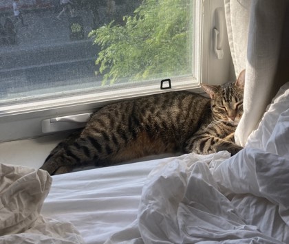 Frankie is a smart huntress who has become my shadow, sending me love blinks from a safe distance out of petting range. I am convinced with time she will one day ask for pets; for now, she indulges a few nose boops and kisses a day. On some mornings I even wake to Frankie purring on my chest, as she knows my arms are safely tucked under my blanket. Frankie is obsessed with chewing paper; she is happy as long as she has a cardboard scratch pad to slowly bite apart and the occasional sacrificial notebook page. She also occasionally drowns her mouse toy in her water bowl in the dead of night-this is a new quirk. But her all-time favourite is any rope; I think I won Frankie over mainly because I animate strings to hunt.