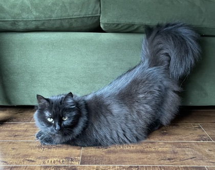 In the meantime she loves being pet with a back scratcher and will flop and show her belly for you to scratch. She will sometimes softly cry to let you know she would like some attention and often perks up when you walk by with the hope of pets.