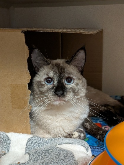 I'm a very shy girl and I take a bit of time to get used to people around me. I do love having another kitty companion, it really helps my confidence! When I'm comfortable I enjoy playing, I think wand toys are the best. I prefer to have a quiet space and maybe a box to hide in, it helps me feel safe.