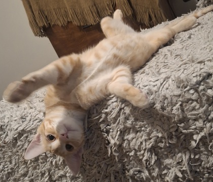 Meet Christopher, an energetic, active youngster who is looking for him forever home! Christopher, or Chris for short, can play for hours. He loves playing with large dogs, but can get caught up in the moment and play too rough. He also enjoys exploring, lounging around, snacking, and following his favorite human around the house. Growing up as a single kitten in his foster home meant that he did not have kitten siblings to play and wrestle with, so his foster mom has had to teach him some etiquette. He will likely continue needing guidance and training, as well as lots of physical activity, as he grows up. His foster mom also recommends him go to a home with children aged 15 years and up, as he can play a little too rough sometimes. Chris has so much love to give and is very ready to find his forever family. Please give this sweet, energetic boy the chance he deserves!