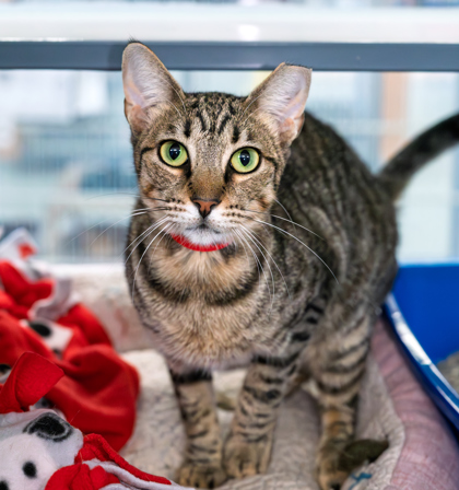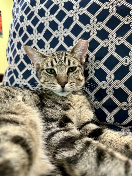 June is a brown Tabby female who is very affectionate but does not like other cats, so needs to go to a home that does not have another cat. We don't know how she does with dogs. June was found as a stray and was born 8/2024. (CC 8-11-2025)