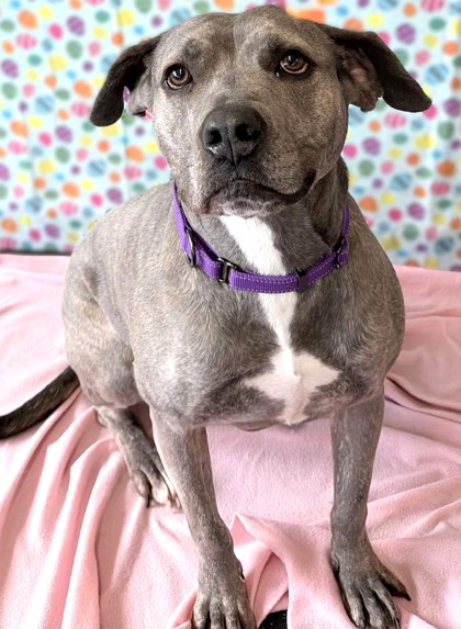 My name is Lilly-Staff think I am a mix of a lab and a mastiff mix - my coat is unique as it is a silvery gray and brindle and I have light brown eyes. I had arrived at the shelter with my 2 puppies, Iris & Sunny. Those days of being a mom are over now...as I am spayed!!! I am a very strong girl and would do best in a house without children, dogs or cats....I need to be your one and only!!!