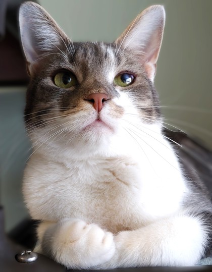 Johnny is a very cute, curious, loving and friendly fella. He arrived at the shelter as a very shy/reserved kitten who took some time to come out of his shell. He has made so much progress that he has been promoted to our cat hallway greeter! He now has the important job of greeting visitors as they enter the cat side. We are so proud of Johnny and the amazing progress he has made!