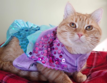 Uno comes across as a shy kitty-but she is actually very sweet and loves to be pet! She is also absolutely adorable...just look at that cute orange face!