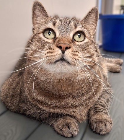 All of that patience paid off. I've grown so much that I've been promoted to hallway duty. I'm the first face you see when you step into the cat wing of the SPCA. I greet you with a chirp, a confident strut, and a graceful weave around your legs, like I've been expecting you all along. I soak up attention like a star, then flick my tail to remind you that royalty enjoys affection... on its own terms.