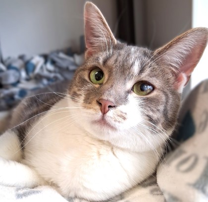 Even now, I'm still shy and a little skittish, but I'm also very sweet once I know you. While I'm not a fan of being held, I like to sit nearby, keeping you company while you read, rest, or move through the quiet rhythms of your day. And when I feel truly comfortable, I'll start to talk to you in soft little meows; it's my way of saying, I'm here and I like being with you.