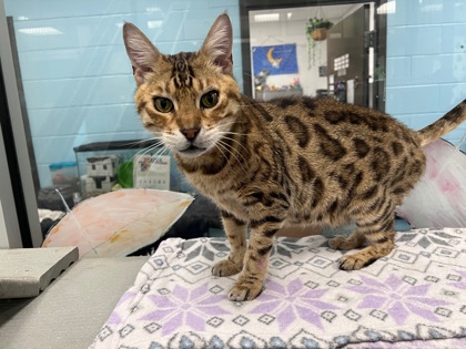 Meet Bruce and Benny. Bruce and Benny are a dynamic duo of Bengal cats that are the best of friends and they must be adopted together. We think they would do well in a home where it is just the two of them though they may get along with one other cat. Both boys do not get along with dogs and they would do best with children 10+ years old. They both love catnip toys and will even roll around on the floor for sprinkled dry catnip. They are affectionate with people and can be lap cats at times. Benny and Bruce love cat trees and being able to climb all over. Bruce is blind, so adopters will need to make sure they aren't moving furniture around often, consistency will help him thrive. Bruce also has a skin allergy and is currently on a sensitive skin and stomach salmon diet, but adopters should follow up with their veterinarian for long term care. Bruce had a dental procedure in the past but it doesn't slow him down when it comes to meal time! Benny has had a dental procedure as well, so there will be an added cost to their fees. If you are looking for two stunning, easy going, and vocal cats, then stop by the shelter today to say hello to Bruce and Benny.