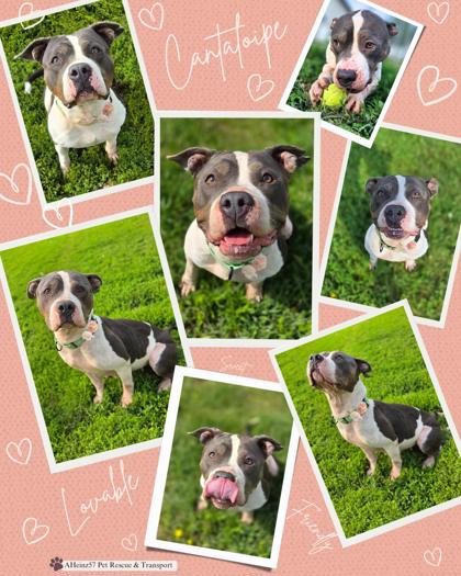 Despite her rough start, Cantaloupe is a certified cuddle bug who's always ready to shower you with kisses. She is known for licking her door, and if you walk through our Adoption Center, you may even see her tongue sticking out (silly girl)! She gets a little anxious in her kennel-especially during storms-but once she's outside, the zoomies take over and her joy is contagious!