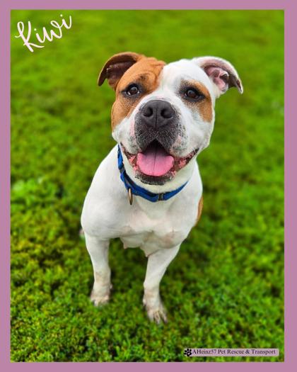 Kiwi is a 2-year-old Pit Bull Terrier mix with a classic blocky head and a strong, athletic build. She came to us underweight, but don't let that fool you - Kiwi is a powerful girl with a big personality and an even bigger heart.