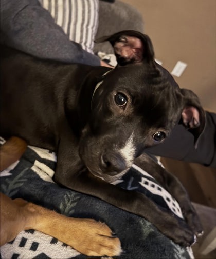 This 4-month-old, 21-pound Lab mix is equal parts goofy and adorable. She's got the sweetest puppy eyes, a little white chin kiss, and ears with major personality.