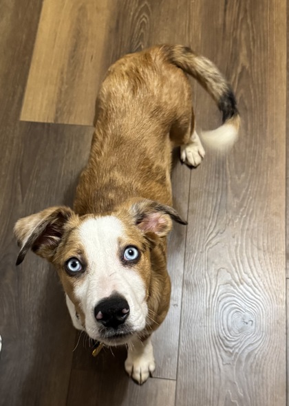 One look into Snowy's bright blue eyes and you'll understand why everyone falls for him instantly. At just 5 months old, this sweet boy already has a way of looking right into your heart - with a gaze that's curious, gentle, and full of hope. And those ears? They have a personality all their own... one up, one out, one flopped, always ready to perk at the sound of your voice. They're impossible not to love.