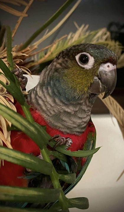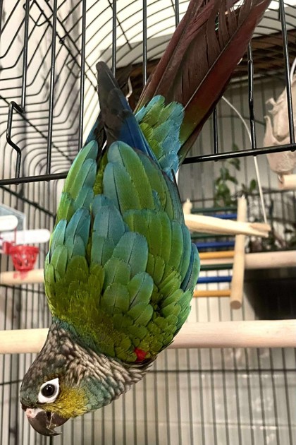 Baby is a sweet and social conure, who was born in 2024. She has been passed through several homes in her short life at no fault of her own. Despite so much change Baby remains curious and trusting. She is tolerable of gentle handling and enjoys the company of bird savvy people. Baby is now ready to find her forever home. She would thrive in a home where she receives lots of attention as she likes to be a part of the action but would also benefit from an experienced bird owner who can provide her with boundaries as she matures into an adult. She has some favorite mobiles in her cage and is learning how to forage for treats hidden in egg cartons. Baby will require a large cage with specific size requirements which must be verified prior to adoption. Conures can live 15-25 years, adopters must be aware of the commitment prior to considering adopting a parrot. Conures also tend to bond to their humans. A home with prior large bird experience is an asset. Baby would thrive in a home with a family or individual who can spend lots of time with her and allow her ample time outside of her enclosure as well as one that can provide a variety of enrichment opportunities to ensure Baby remains happy both mentally and physically. If interested in adopting Baby, please submit an application for further info and to discuss the adoption fee.