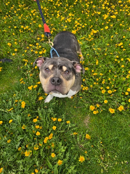 HI I'm Junior! I'm like a big dog in a midsize body. With my short gravity base I can be a strong dog, but after a while I ease up pretty well on walks. I can be intimidating at first until I ok you but after that we're all good. I am a confident dog and get along with most everyone. Let's be real, how can you not like this face?