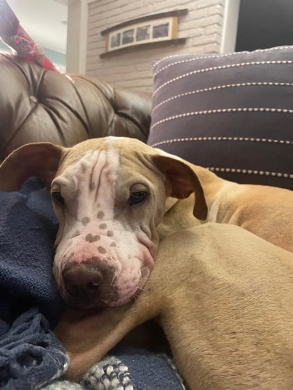 My name is Rudie, and not only am I a strapping pup; I am adaptable and affectionate. My friends tell me that my paws are huge, but don't worry, I know how to use them gently. My activity level and bark show my puppy personality, but after a burst of playful energy, I love to relax next to my human. You may not be able to tell in my picture, but my forehead wrinkles come from my Shar-Pei side, are soft like silk and will feel nice as I lean into you and give you lots of cuddles.